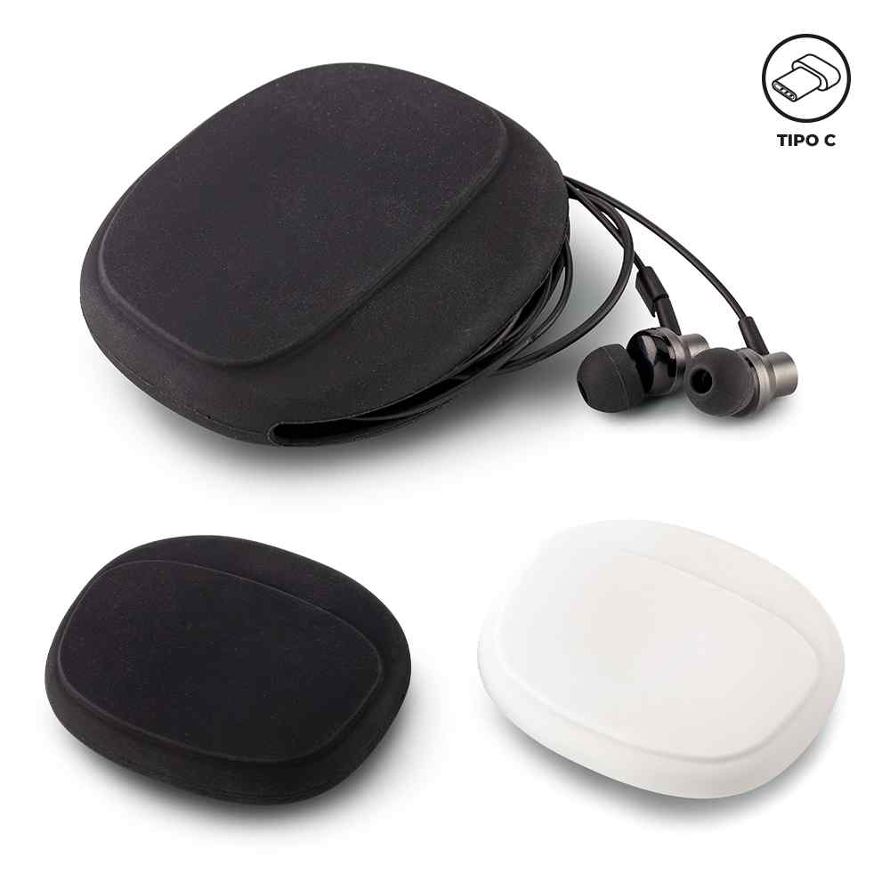 Audífonos plásticos con conexión Tipo C en estuche de silicona.
