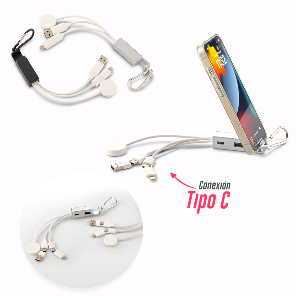 Cable multicargador. Con puertos Tipo USB y Tipo C. Cables con conectores lightning, Tipo C y USB. Cargador para Smart Watch. Con soporte para celular y gancho carabinero.