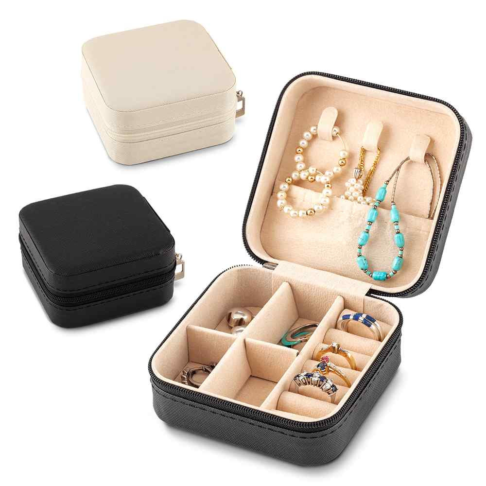 Joyero en imitación cuero con cremallera. La parte superior interna tiene 3 ganchos y un bolsillo elástico.