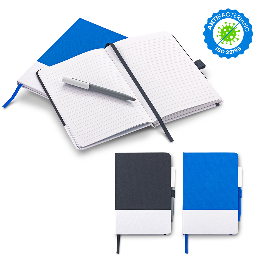Cubierta en tela poliéster con material antibacteriano. Incluye bolígrafo antibacteriano. 80 hojas de papel 70g con rayas.
