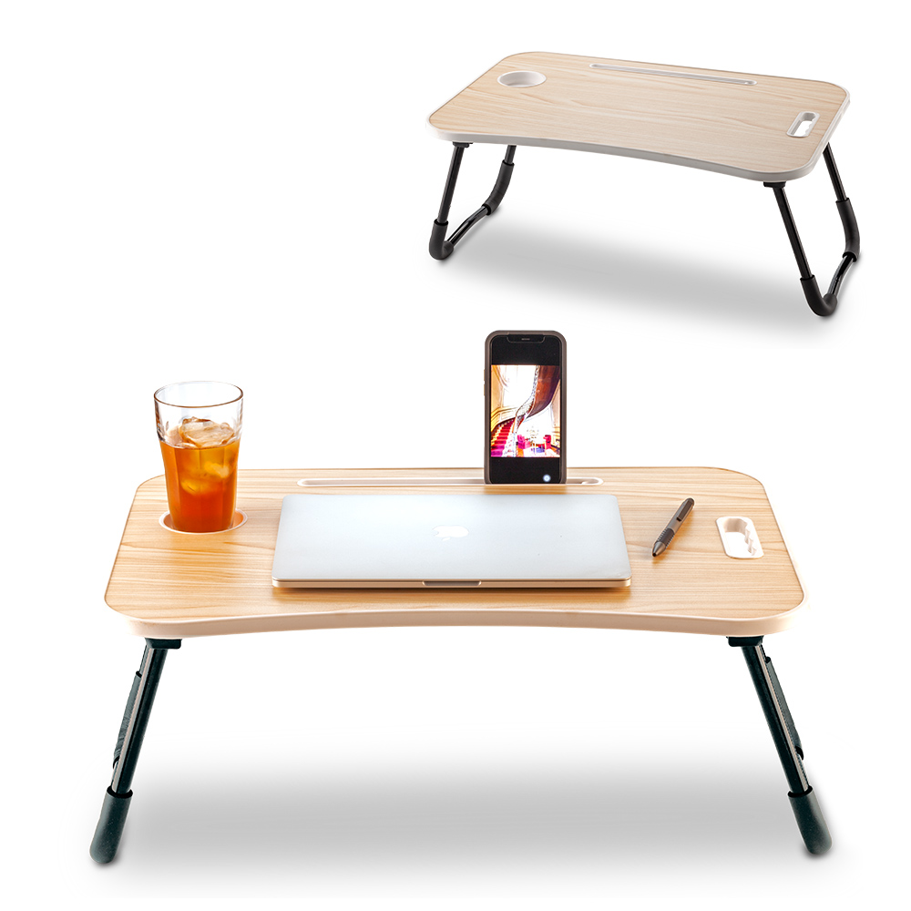 Mesa plegable para laptop en madera MDF lacada, brazos de aluminio. Empaque caja individual.