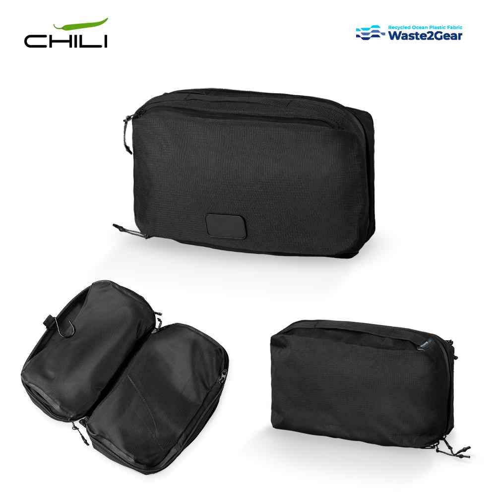 Organizador en poliéster reciclado de residuos plásticos recuperados del océano. Dos bolsillos externos con cremallera. Dos compartimientos internos con cremallera.
