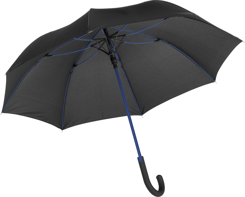 Ø 103 cm. Poliéster Pongee. Paraguas APERTURA AUTOMÁTICA. Eje de metal y varillas de fibra de vidrio de color, puntas metálicas. Mango curvo de goma con botón de color. Cierre con correa de velcro.