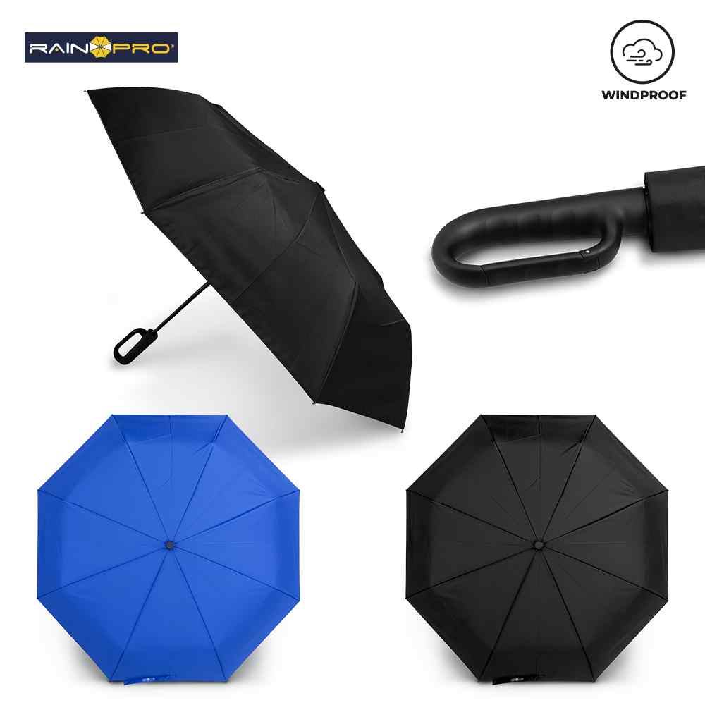 Paraguas plegable de alta calidad en poliéster Pongee 190T. Resistente al viento.Con herraje en aluminio y varillas en fibra de vidrio. Apertura y cierre automático con botón. 8 cascos. Mango tipo carabinero en plástico para poderlo colgar. Incluye funda.