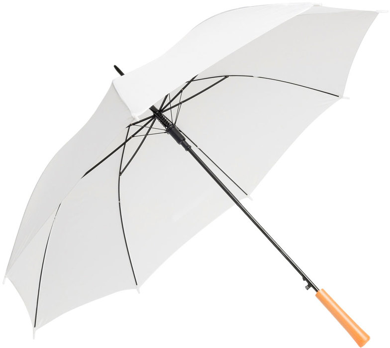 Ø 100 cm. 8 gajos. Ancho gajo 40 cm. Largo total 84 cm. Poliéster, metal y PVC. Paraguas APERTURA AUTOMÁTICA Y CIERRE MANUAL. Eje, varillas y punta metálicas y mango en PVC, símil madera. Botón a presión. Cierre con correa de velcro.