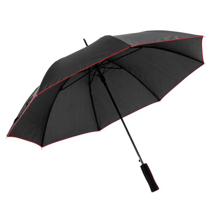 Paraguas APERTURA AUTOMÁTICA Y CIERRE MANUAL. Eje y varillas metálicas. Tela negra con detalle de color. Mango de goma eva de doble color. Botón a presión. Cierre con correa de velcro.