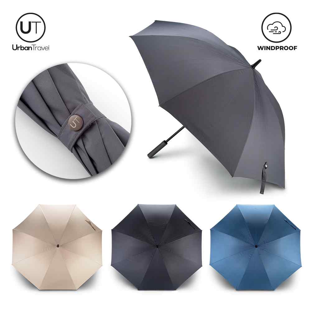 Poliéster pongee 190T. Apertura automática, cierre manual. Herraje en fibra de vidrio. Mango y punta plástica. Sistema antibrisa. Con forro para cargar. 8 cascos.