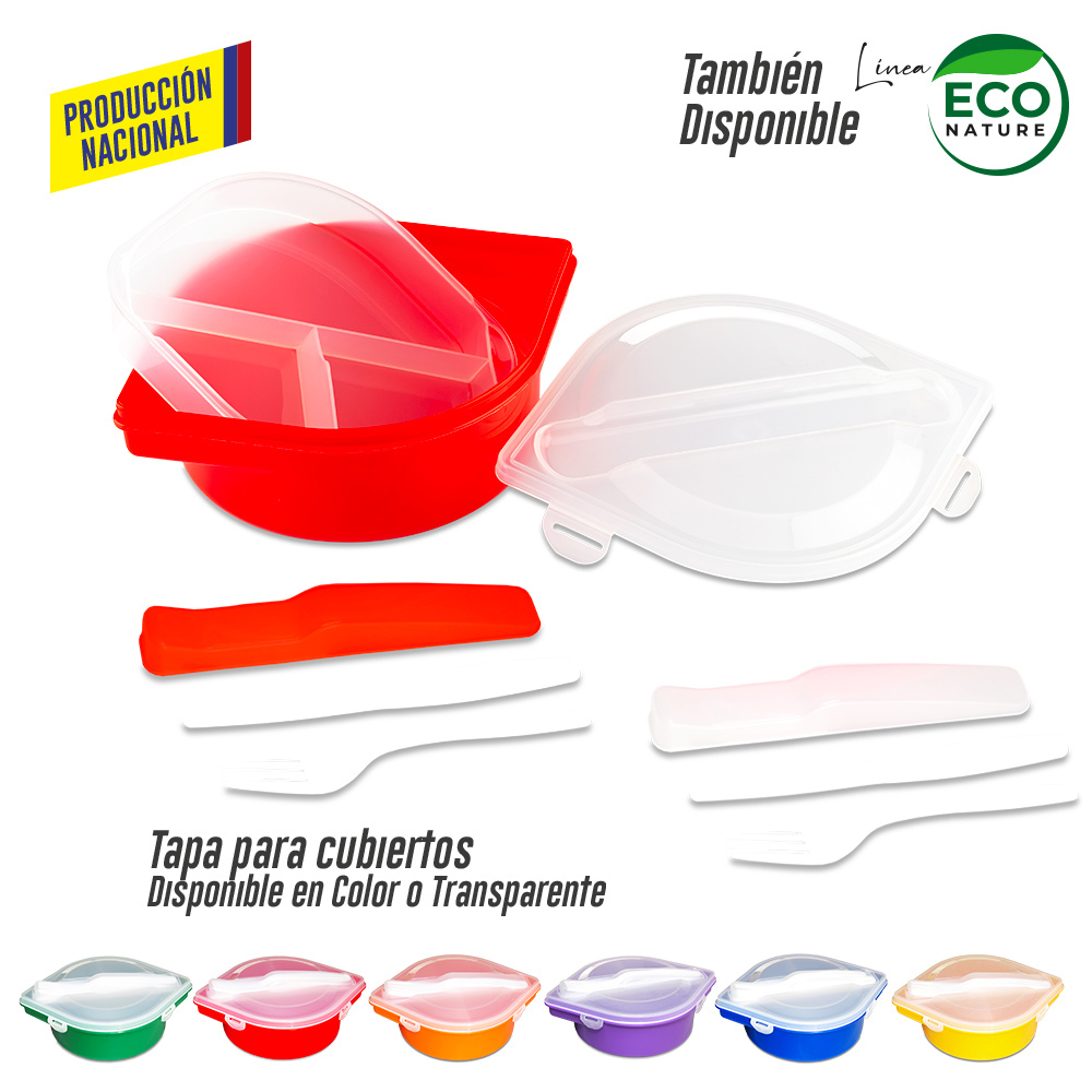 Set portacomida en PP, recipiente interno con divisiones y juego de cubiertos plástico. Cierres de seguridad. Únicamente para calentar comida, no para cocinar. Apto para microondas y lavavajillas (excepto cubiertos).