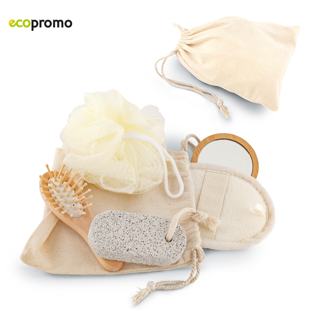 Set de baño y cuidado personal en bolsa de algodón que incluye: cepillo para el cabello, esponja suave, esponja exfoliante, piedra pómez, y espejo de bambú.