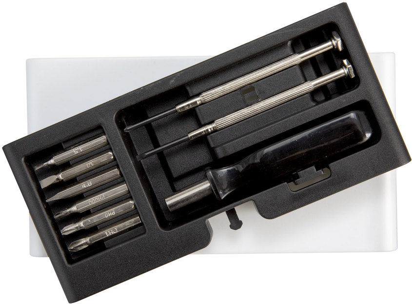 Set de destornilladores. Incluye: 1 mango con punta imantada, 6 puntas diferentes (3 planas: 1,5 ; 3 y 4 mm. y 3 phillips: 0000, 0 y 1mm.) y 2 destornilladores de precisión (1 plano y 1 phillips). Base imantada que permite mantener ordenadas las diferentes puntas. Apertura push.