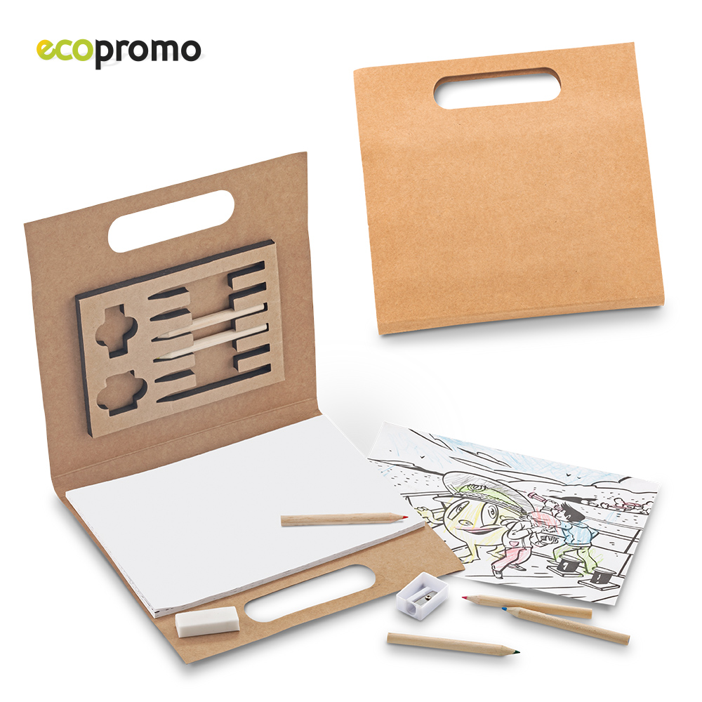 Cubierta kraft de 350 g, papel blanco de 80 g (30 páginas aprox), borrador, 6 colores, tajalápiz. Medidas: 20 cm x 21 cm x1.6 cm.