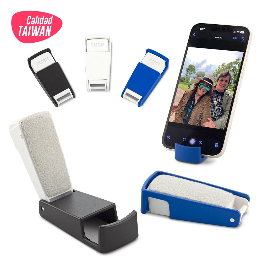 Soporte plegable plástico para móviles. Con limpiador de pantalla en microfibra. Hecho en Taiwan.