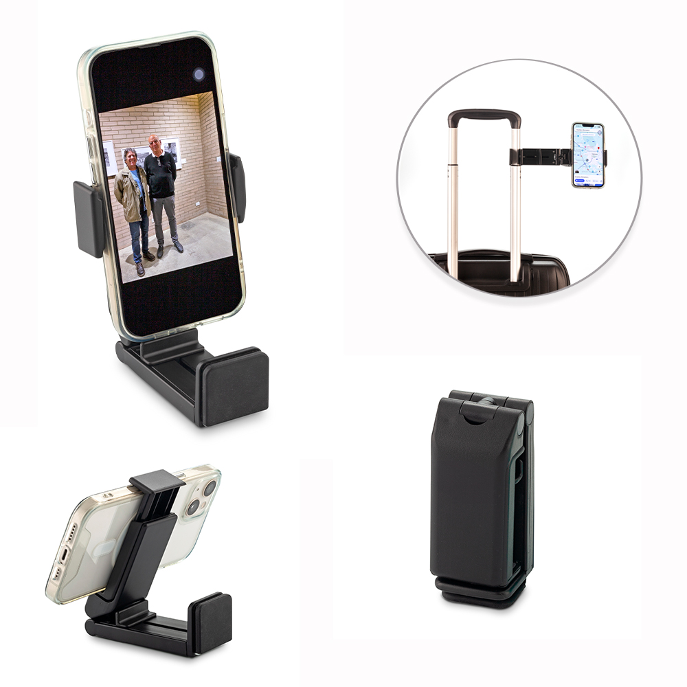 Soporte en plástico para móviles, plegable y escualizable, rotación 360°. Empaque caja individual.